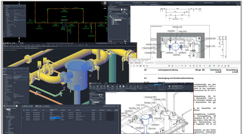 Durch eine Verknüpfung der Objektdaten aus den Verfahrensfließbildern in P&ID und der 3D-Konstruktion in Plant 3D wird eine in sich konsistente Planung sichergestellt. Zudem werden aus den Verfahrensfließbildern und 3D-Konstruktionen heraus die Messstellen- und Antriebslisten sowie Bauteillisten und Massenbilanzen automatisch erzeugt. Aus den 3D-Konstruktionen lassen sich beliebig viele Ansichten, Draufsichten, Grundrisse und Schnitte in kurzer Zeit generieren. Bauteillisten und Massenbilanzen fließen unmittelbar in die LV-Erstellung mit ein. Die Vorteile dieser Arbeitsweise liegen auf der Hand. Eine schnellere, besser nachvollziehbare, sehr genaue und weniger fehleranfällige Projektbearbeitung sind die Folge.